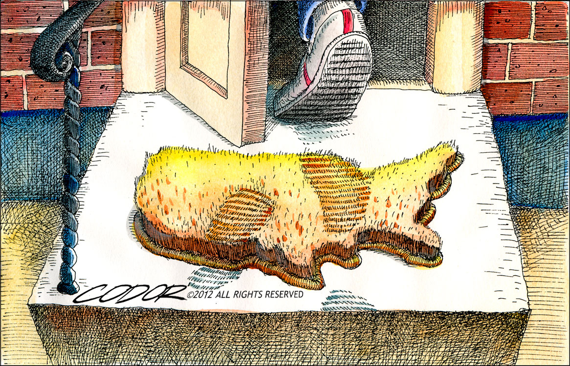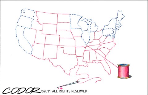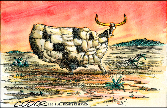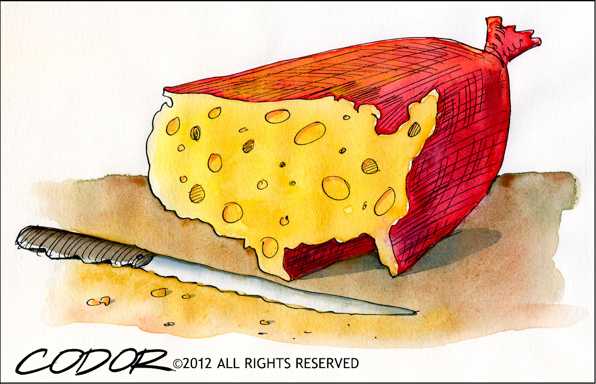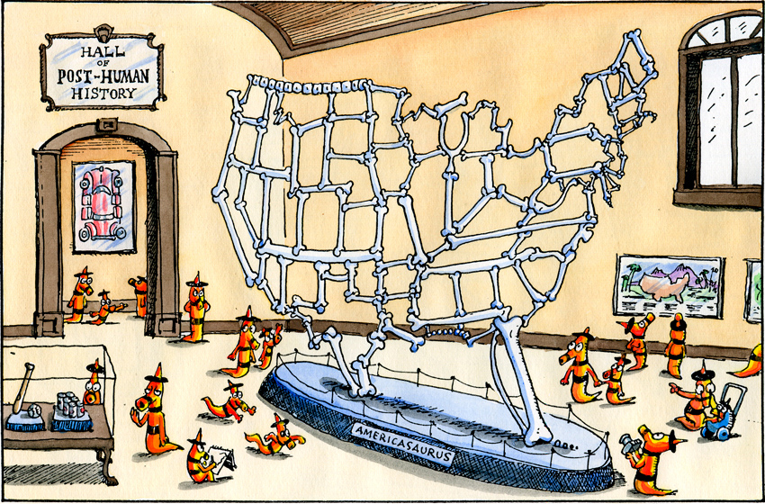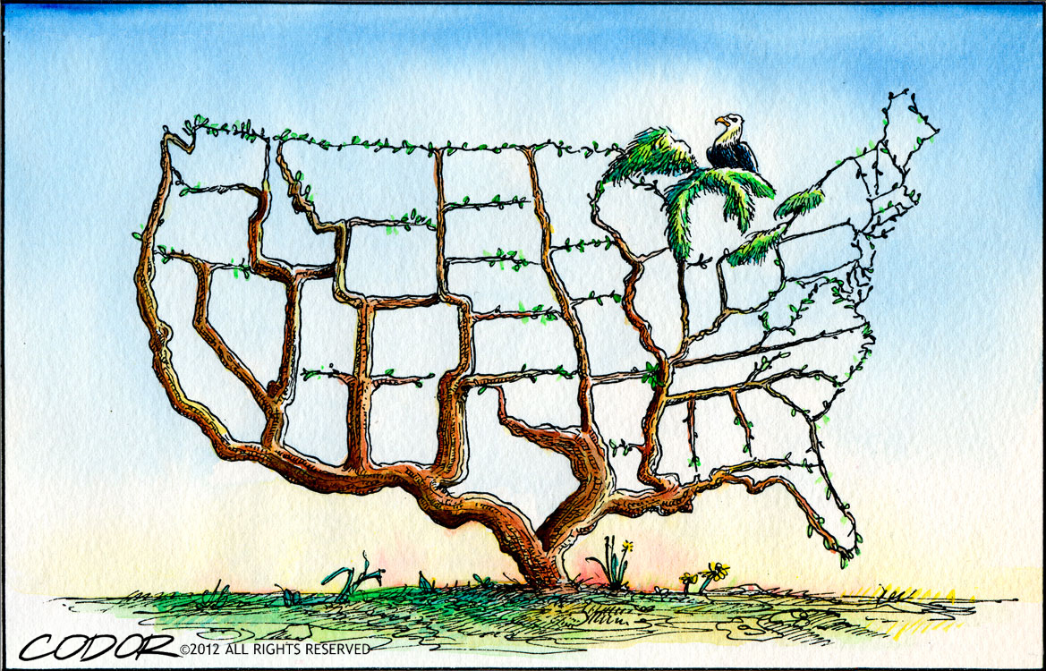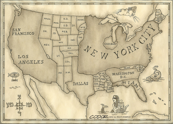 Some years ago I was asked to do a magazine illustration of how Israelis viewed the USA. I asked Israelis what places they thought of when they thought of coming to America. Overwhelmingly they said New York, California, Miami. Everything else was secondary. I made a distorted map based on their views. Working on the map gave me ideas of other satiric, serious, surreal and silly illustrations I could make of the map of America. So was born AmericaTsures.